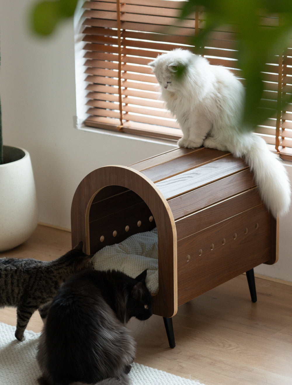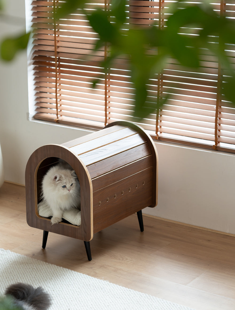 This cat house features a distinctive shape, adding a touch of style to your backyard or patio. The unique design stands out and provides a cozy shelter for your feline friend.